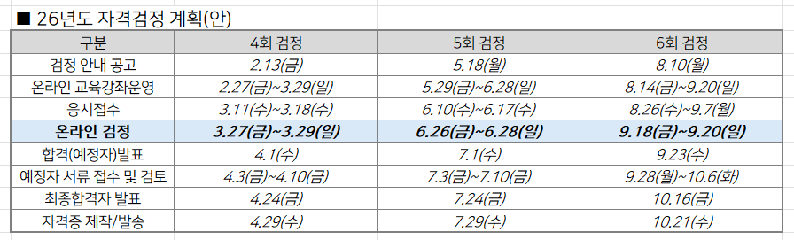 º» ÀÏÁ¤Àº 2026³âµµ ÀڰݰËÁ¤ ½ÃÇàÀ» À§ÇÑ ¿¹Á¤ ÀÏÁ¤À̸ç, ¿î¿µ »óȲ¿¡ µû¶ó ÀϺΠº¯°æµÉ ¼ö ÀÖ½À´Ï´Ù. ±Ý³â ÀÀ½Ã¸¦ Èñ¸ÁÇϽô ºÐµé²²¼´Â °¢ ȸÂ÷º° °øÁö»çÇ×À» ¹Ýµå½Ã È®ÀÎÇÏ¿© Áֽñ⠹ٶø´Ï´Ù.-KEGE ¹Î°£ÀڰݿÀ§¿øÈ¸-